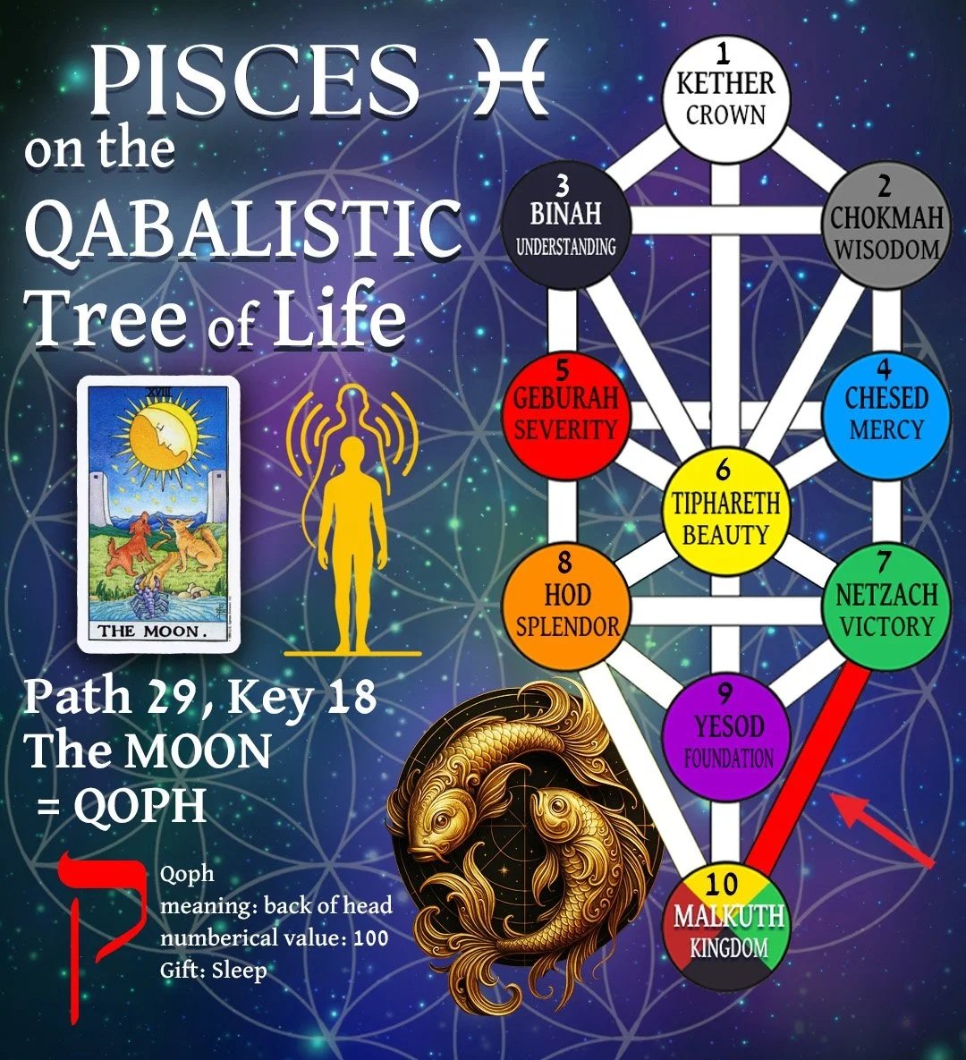 Pisces is represented on the Tree of Life through its associated Tarot Card, which is Key 18, The Moon. The 18th Path connects Netzach (Victory) to Malkuth (The Kingdom) on the Tree of Life. It is described as the “victory of the material world” as well as the “deceptive effect of the apparent power of the material world.” The Hebrew letter for this path is Qoph (ק), which means Back of the Head. Its numerical value is 100, it is a simple letter - its “gift” – is sleep. It is one of three paths or letters that form the word Qesheth, (Qoph, Shin, Tav) which means Rainbow or just simply Bow. These three paths connecting Malkuth (Foundation) to the Tree above it and basically form what can be seen as a Bow and Arrow. The central path of Tav corresponds to the Arrow, and corresponds conveniently to Temperance/Sagittarius (see Sagittarius and the Qabalistic Tree of Life.) The other two paths, Qoph and Resh, form the Bow proper, created by the polarity of fire and water, with Shin as the fiery spirit and Qoph as the watery reflective.