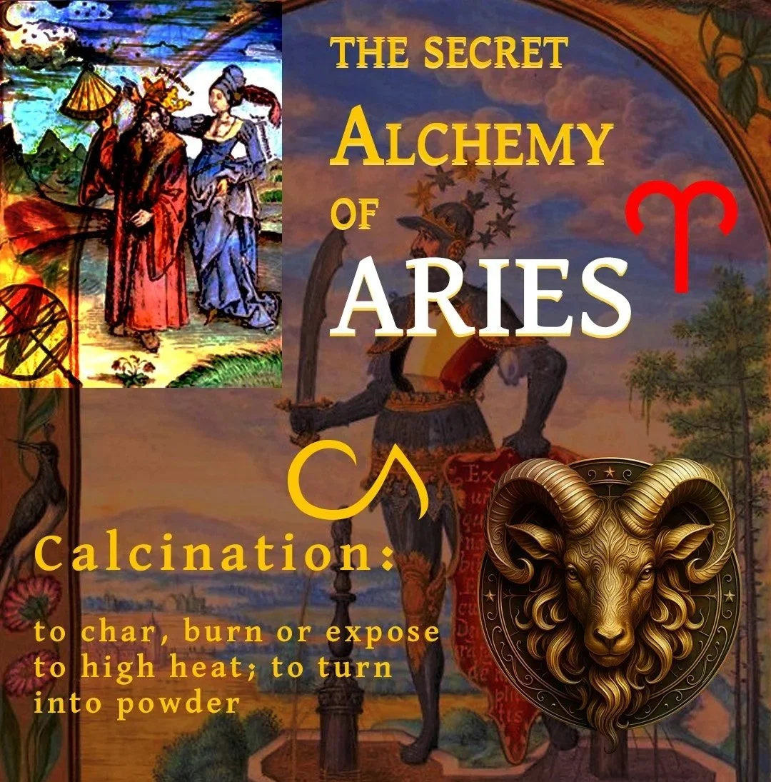 The Alchemical Operation assigned to Aries is Calcination. Calcination, to burn, is one of the 7 Operations that are more commonly known, and many find the term confusing, as it is fairly close in meaning to Incineration, which also means burning. However after much research, the distinction we have come to settle on is that Calcination is a psychological burning away of unwanted parts, to physically create powders or burn with acids, or to dehydrate, and can also indicate the initial flame of the Alchemical journey. Incineration, on the other hand, is burning with the intent to completely reduce to ash, like the physical process of cremation. The fire of Calcination is not an obliterating fire, bur rather burns away unwanted, unnecessary, contaminated or otherwise un-useful parts, either by transforming the material into powders or other useful types of calcine or oxides, or burning away everything except what is essential. It is considered the first step in spiritual journeys, as societal programming, self-lies, facades, hardened psyches and hardened dominant Egos must all be burned away for any genuine growth to begin.